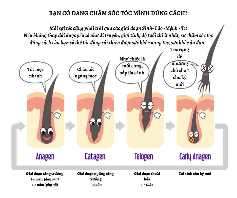 ✅Một sợi tóc sẽ trải qua chu kỳ sinh trưởng 3 giai đoạn: Tăng trưởng (2-4 năm ở đàn ông, và 3-6 năm ở phụ nữ); Ngừng tăng trưởng (nang tóc thoái hóa 1-3 tuần) và Giai đoạn Thoái hóa (kéo dài 5-6 tuần)...