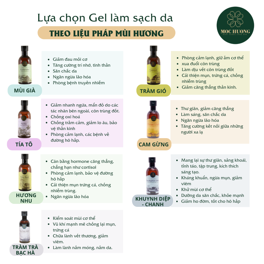 Ở Mộc Hương, bạn có thể lựa chọn sữa tắm dựa vào mùi hương. Và hơn thế nữa, mỗi loại sẽ được thiết kế công thức riêng phù hợp với từng loại da, mang những liệu pháp trị liệu tốt cho sức khoẻ khác nhau. Nếu bạn còn phân vân khi lựa chọn loại Castile Liquid Soap để rửa mặt hay sữa tắm nào cho cả nhà có thể tham khảo những gợi ý này của Mộc Hương nha.