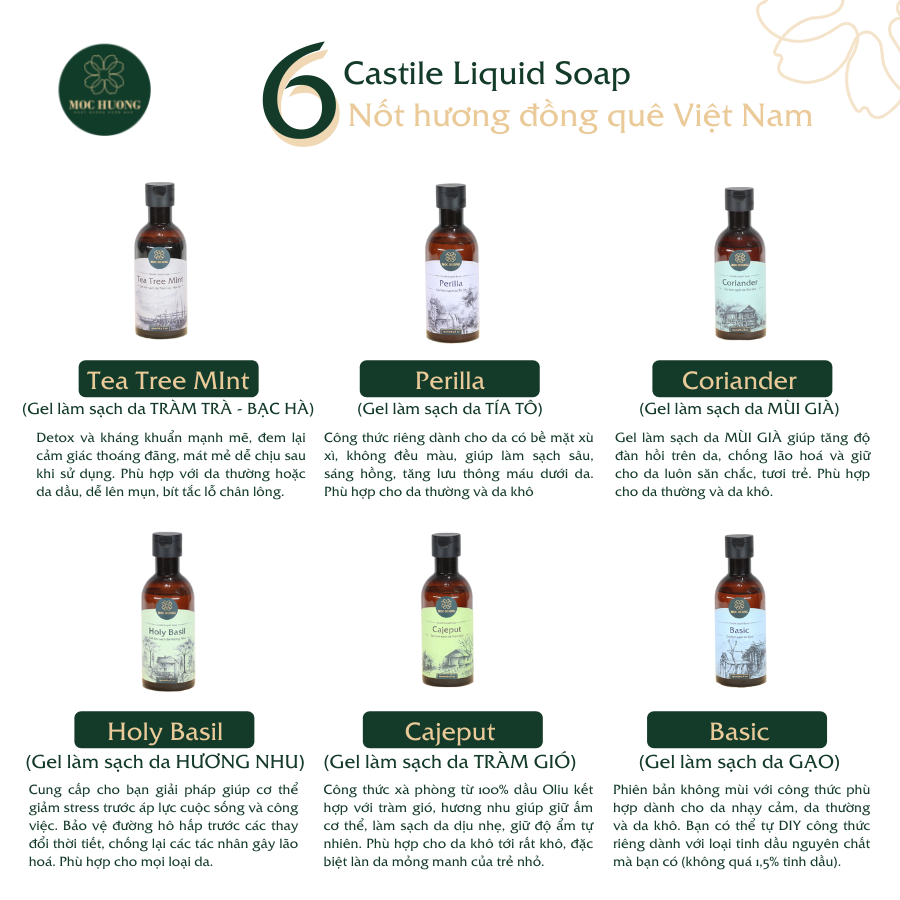 Vì sự thân thiện với làn da và môi trường sống, tất cả các sản phẩm làm sạch cơ thể của Mộc Hương đều từ castile soap hay còn gọi là xà phòng thực vật.