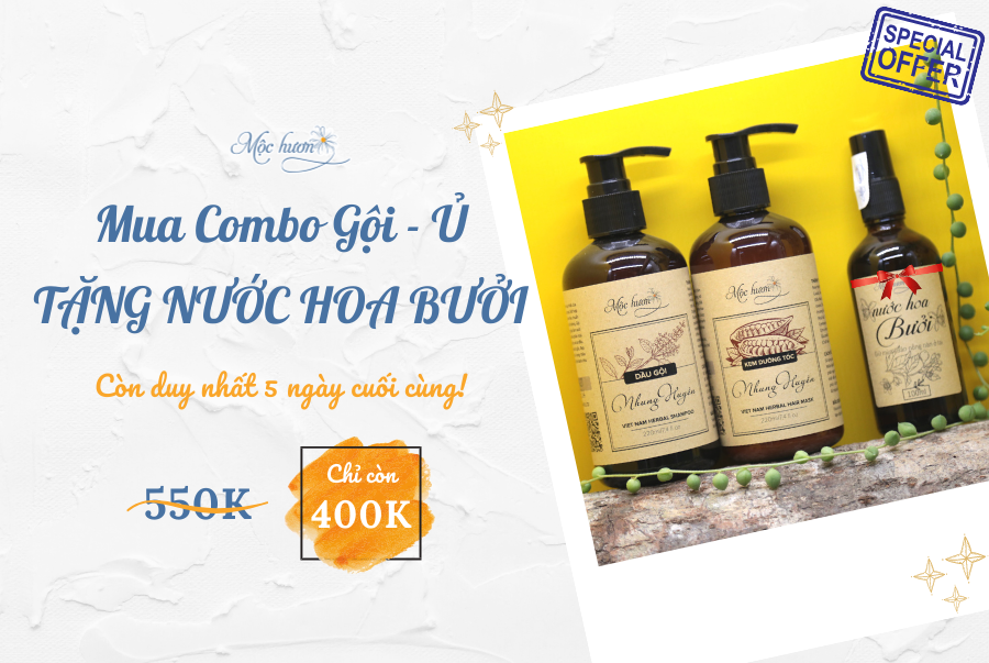 Mộc Hương sẽ áp dụng chương trình TẶNG NƯỚC HOA BƯỞI khi mua cặp DẦU GỘI + KEM Ủ TÓC THẢO MỘC NHUNG HUYỀN cho tới hết ngày 31/10 nhé cả nhà. Chỉ còn 20 chai nên chương trình có thể kết thúc sớm hơn nếu hết hàng ạ.