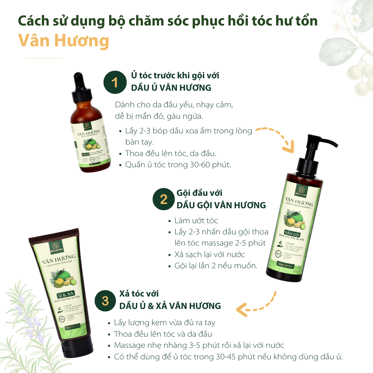 Với khách hàng có ít vấn đề với mái tóc hay tóc thường chỉ cần bộ đôi Gội và Ủ & xả. Còn với người có da đầu yếu, nhạy cảm, dễ mẩn đỏ, gàu ngứa hoặc khách hàng có nhu cầu kích thích mọc tóc nhanh hơn hoặc ngại ủ tóc ướt dễ nhiễm lạnh thì nhất định nên có thêm Dầu ủ Vân Hương.