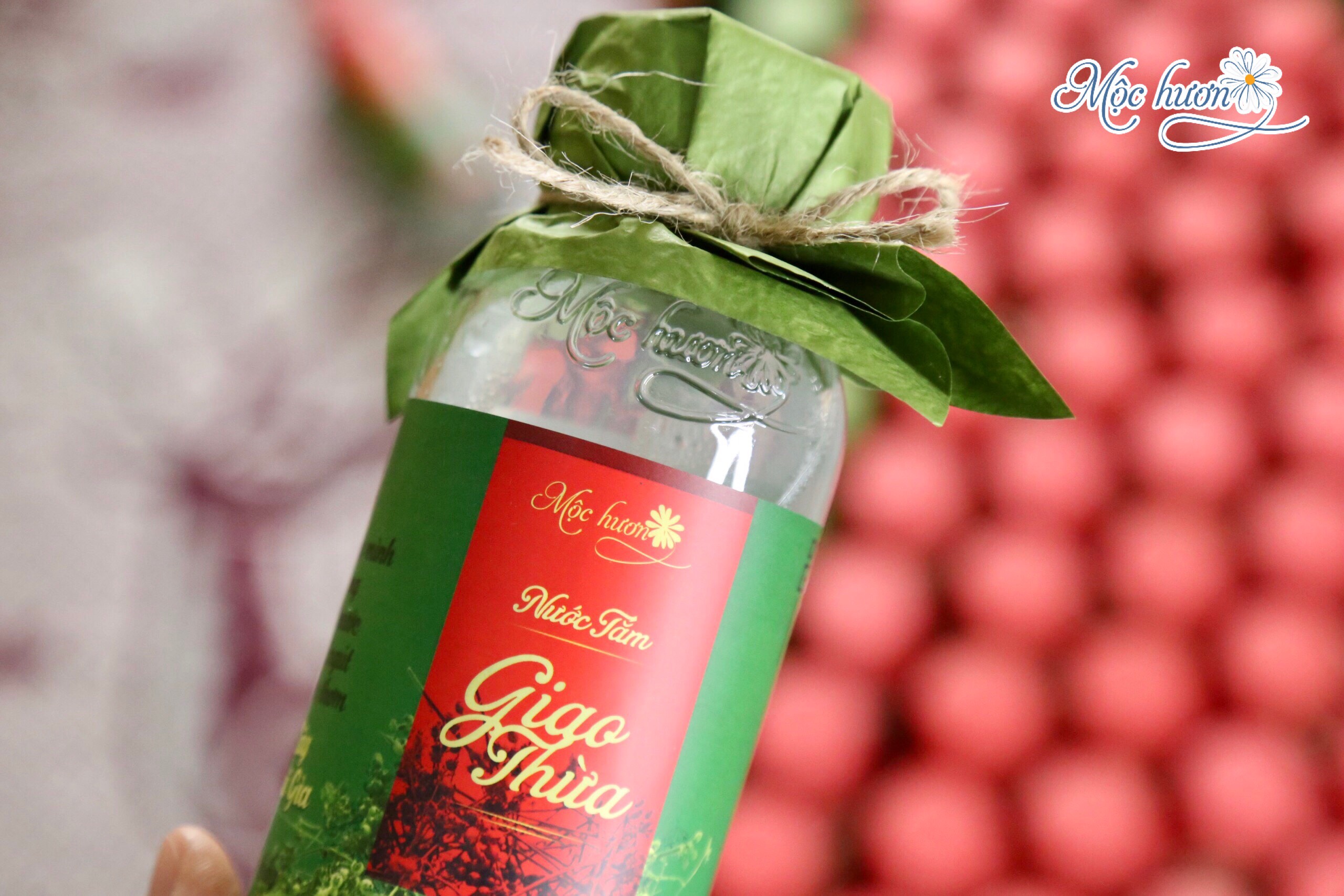 Nước tắm Giao thừa chính hãng có in logo Mộc Hương dập nổi trên thân chai