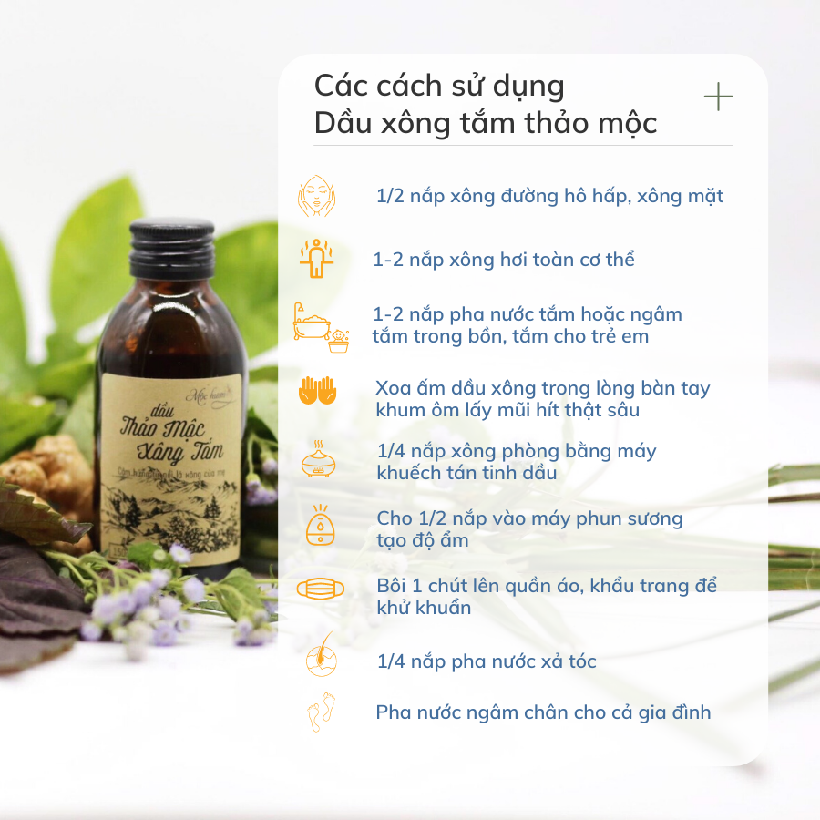 Bạn có thể tận dụng Dầu xông tắm thảo mộc của Mộc Hương để tắm, xông mặt, xông cơ thể hay xông phòng, bôi lên quần áo, khẩu trang để khử trùng...