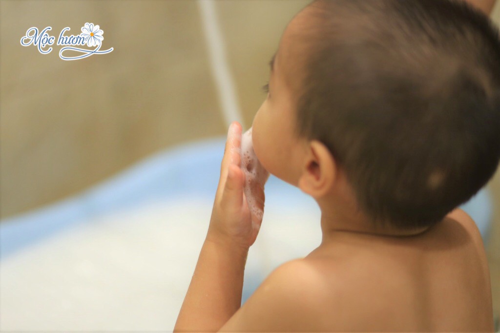 Trong ảnh là một Mộc Hương nhí đấy ạ. Bí quyết nho nhỏ để có 1 chậu tắm ngầu bọt đó là cho 1/2 nắp dầu xông tắm thảo mộc vào chậu, sau đó xối nước thật mạnh. Tuy bọt không giữ được lâu nhưng các bé rất thích và hứng thú mỗi lần đi tắm.