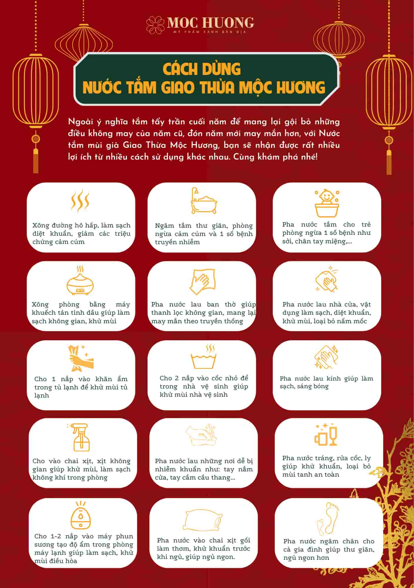 Nếu nhà bạn có con nhỏ, hoặc có người thường gặp vấn đề về hô hấp, sẽ rất tuyệt nếu luôn có sẵn một chai nước tắm này trong nhà. Bởi Nước Tắm mùi già Giao Thừa của Mộc Hương không chỉ là bản hòa ca tuyệt vời của những ký ức, nó còn là một sản phẩm VÌ SỨC KHỎE của cộng đồng. Với công dụng kháng khuẩn, kháng nấm mốc tự nhiên cực mạnh, Nước Tắm Giao Thừa của Mộc Hương có tác dụng ngăn ngừa cực tốt các vấn đề nhiễm khuẩn, giúp làm sạch đường hô hấp, đẩy lùi các triệu chứng cảm cúm. Thêm nữa, mùi già còn có khả năng phòng ngừa tốt đối với các bệnh dịch như sởi, tay-chân-miệng, và các bệnh nhiễm trùng, nhiễm nấm trên da.