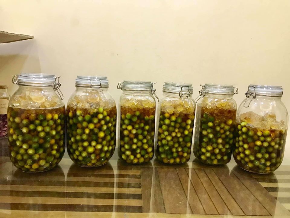 Những quả chanh rừng nhỏ xíu thơm phức được trồng tự nhiên. Sau đó ngâm đường phèn kết tinh tự nhiên và mật ong từ vườn sau mùa hoa mùi già. Đặc biệt bổ sung thêm bạc hà nên siêu sảng khoái. Để trong tối suốt 6 tháng.