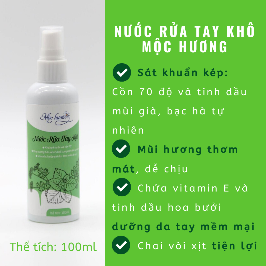Nước rửa tay chứa cồn là một trong những biện pháp được khuyến cáo nên sử dụng trong những trường hợp không có điều kiện sử dụng xà bông và nước. Nếu bạn không muốn sử dụng những nước rửa tay mùi như “nước tẩy bồn cầu” hay “thuốc xịt gián” vừa hắc xì vừa dễ bị khô da thì nước rửa tay khô Mộc Hương là sự lựa chọn thông minh. Với nồng độ cồn 70 độ có thể tiêu diệt hầu hết các loại virus, vi khuẩn, Mộc Hương còn chứa tinh dầu mùi già, bạc hà mang lại mùi thơm mát, tự nhiên, kết hợp vitamin E, glycerin thực vật và hoa bưởi dưỡng da tay mềm mại.